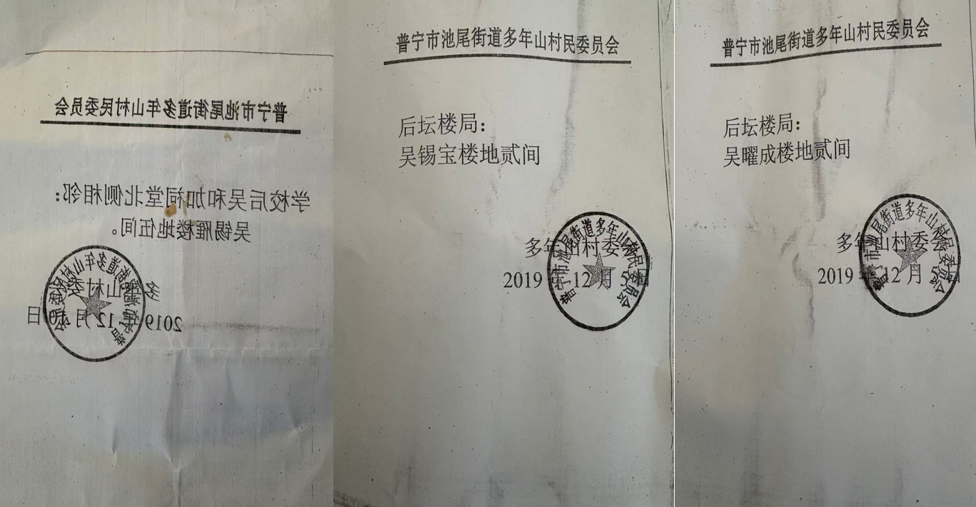有村民向媒体提供了三张特殊文件,文件是关于土地及房屋相关事宜的批示件,上面均盖有村委会的印章。批示件抬头显示为“普宁市池尾街道多年山村民委员会”。批示件中明确提及了9间房屋所处的土地情况:在学校后与吴和加祠堂北侧相邻位置,有吴锡雁的楼地5间;后坛楼局处,有吴曜成的楼地2间;同样在后坛楼局,还有吴锡宝的楼地2间。从现场状况来看,这些土地上似乎尚未进行建设,但村委会的批示已然存在。村民们认为,这些批示件足以证明村干部存在违法乱纪的事实。